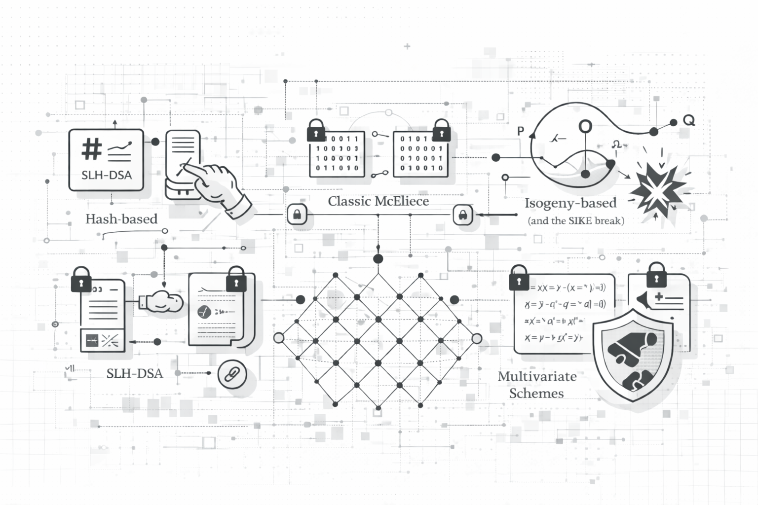 Cryptographic diversity is a hedge against catastrophic breakthroughs. While lattice-based schemes (ML-KEM, ML-DSA) are NIST's primary standards, alternative approaches provide backup options if new attacks emerge. This article explores these alternatives and the sobering lessons from schemes that were broken.